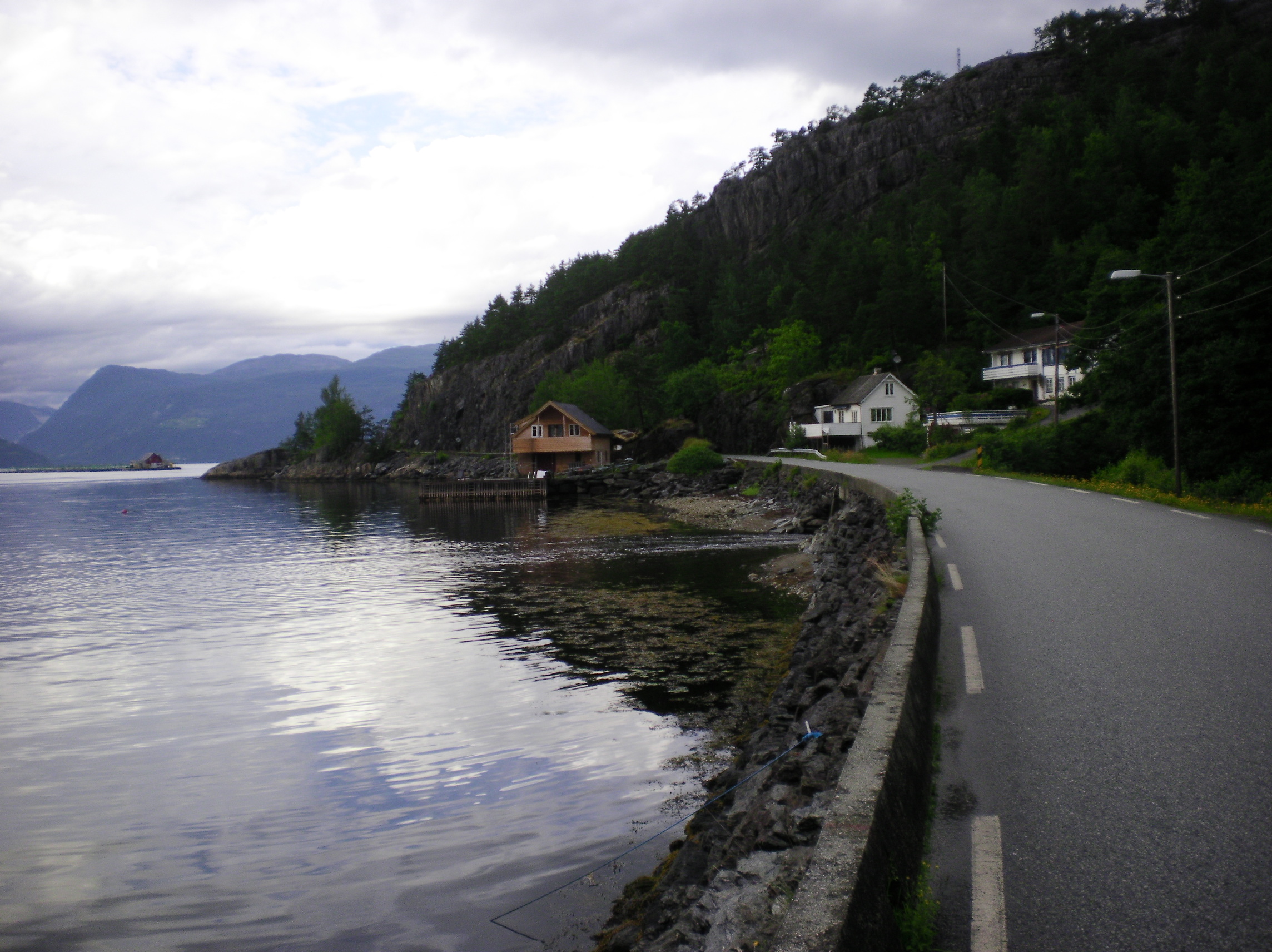 I warm up in the ferry waiting room and observe a family feasting on hot dogs, mother can’t finish hers and throws away more than half of a juicy frank. The steam continues to rise from the garbage. The ferry is designed for automobiles, and does not offer shelter from the storm, I wait in the restroom for the sounds of the engine to stop. I depart the ferry in Jondal, (one of the best fishing spots in western Norway). Utne is about 35 km north and is the only name that I have been able to pronounce correctly).  This is fruit country. Outside of each town is a small kiosk where fruit is being sold, and I see raspberries, cherries and currants. I pass a house with two people sitting outside smoking, and decide to try the Julian charm. ” Do you know if there is a spot nearby where I can camp under a roof and be dry for the evening”? Response “I have a house nearby and you can camp there”, “just cycle over that hill and I will meet you”.