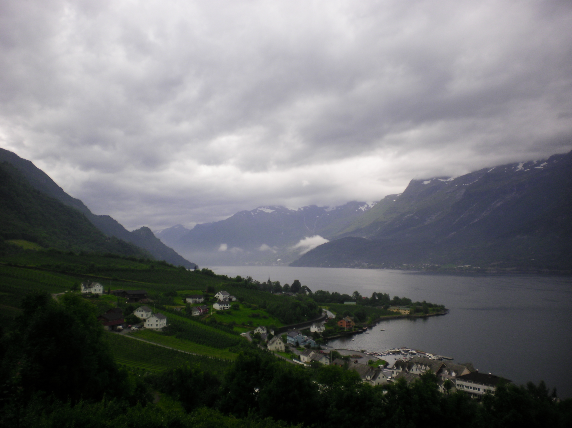I cycle up hill to Utne and marvel at the beautiful, historic hotel built in 1722. Just outside of Lars’ hometown, Grimo there is a dirt road that leads up the mountain to an ancient Viking site. It is so steep that I have to push gaby in the mud. The rain just doesn’t stop and I befriend a farmer working on his tractor on the way back to town. It is already 5pm by the time I take the ferry from Utne to Kinsarvik. On the ferry I run into the farmer again. He asks me where I am headed and I tell him hopefully to a dry place. He invites me to his house and offers me room to sleep. He lives in the town of Loftus, and has many acres of Morello Cherries.