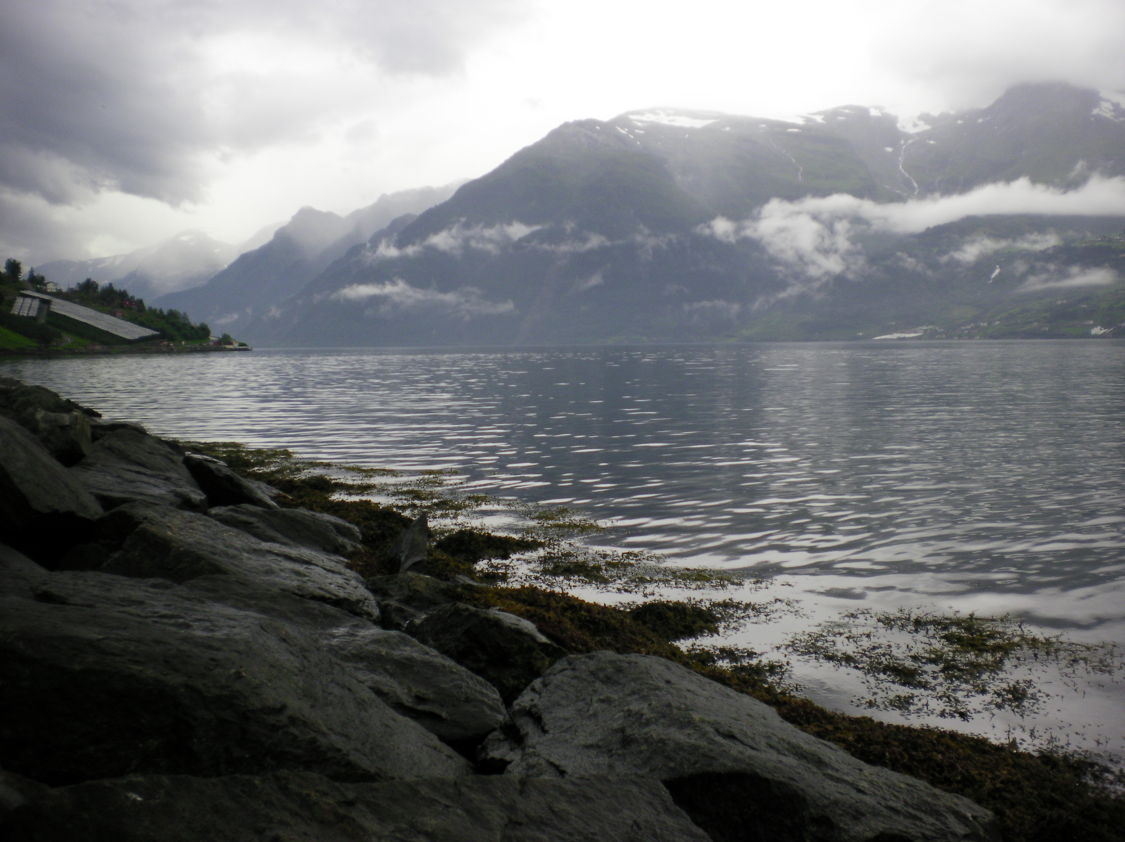 The sky was overcast and rain looked definite as I departed from Bergen. My bike felt especially heavy as I carried it up and down stairs trying to find the bike route out of town. After much talk with several cyclists I have decided to cycle the Rallarvegen route to the fjords in the city of Flam. The route was an early logging road used in the1930’s and is now too rough for automobile traffic. It is said to be one of the best cycling routes in Norway but to get there and to avoid the endless tunnels I have to take a bit of a detour. Instead of riding north, I will head south to the city of Os, where I head across the fjord on a ferry to Venjaneset. While on the ferry the rain starts and I can tell its going to be a long day, as I prepare to get soaked I contemplate my shoe options. Other than my funky sandals I have one pair of shoes and socks. Please comment on this but I feel that It is better to ride in sandals in the rain than get my shoes and socks wet. If these are dry I can put them on at the end of the day to warm me up when I cook, plus it could take me days to dry the shoes. It is not the coldest rain but downhill riding can be pretty cold. From Venjaneset the road hugged the fjord, and I passed waterfall after waterfall heading north. In the small town of Eikelandsosen I head inland and climbed to the top of a step pass. “Be happy even though the body is not” I keep telling myself, and look forward to a nice warm sleeping bag.