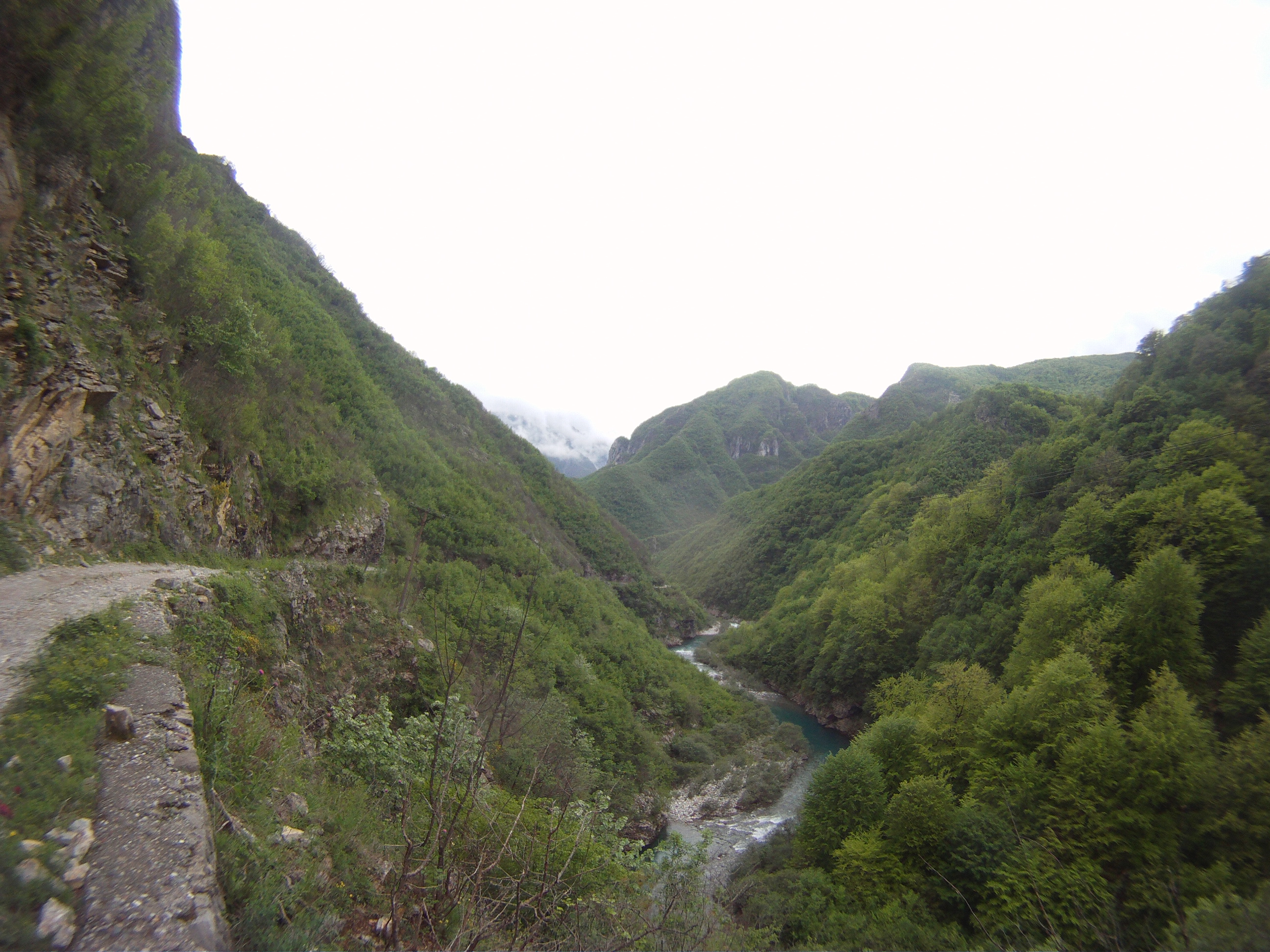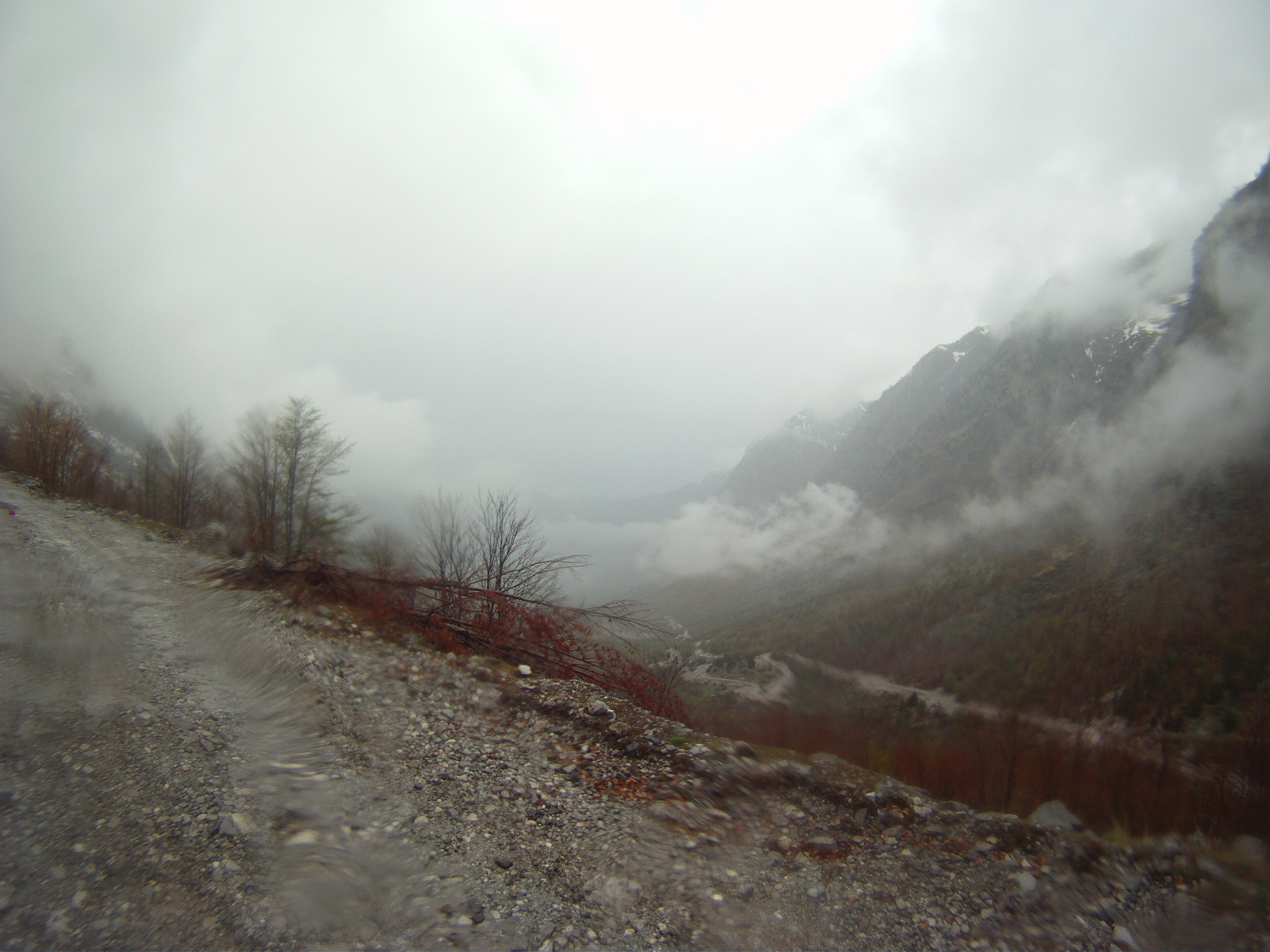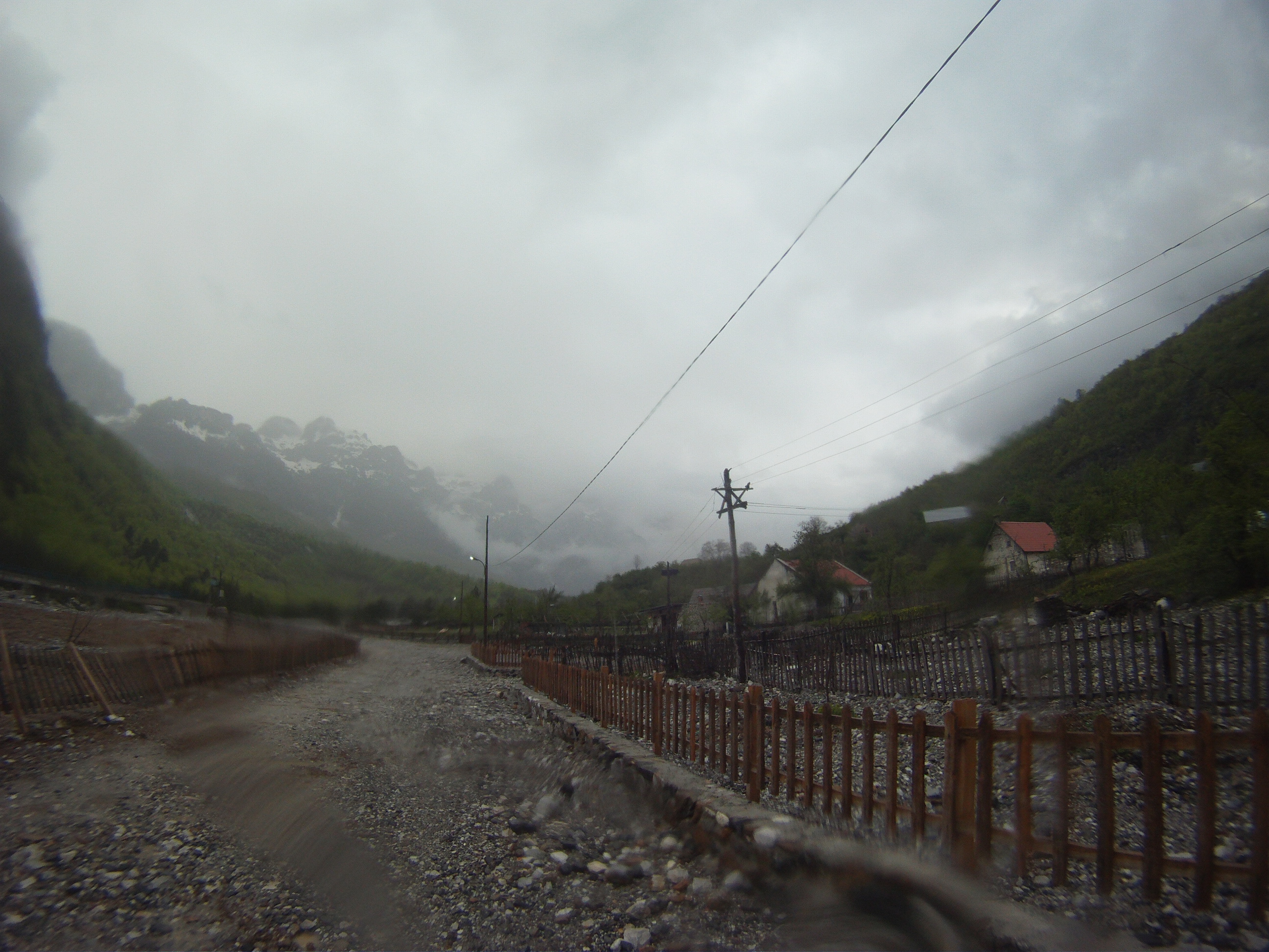 Just before leaving I asked a few locals about the road conditions to Thethi, I got a few laughs and headshakes; some would raise their hands over their heads and shout “Boar” (snow) “No way”!! I have built quite a tolerance to people telling me that what I want to do can’t be done and as always I smile and whisper to myself “We will see..”. It is all up from here, leaving the banks of Shkoder lake, the road slowly climbed through humid green luscious valleys. It started to rain, but being so excited I neglected to take any precaution and continued to climb passing small villages and often being overtaken by the ever present Mercedes Benz off road van.