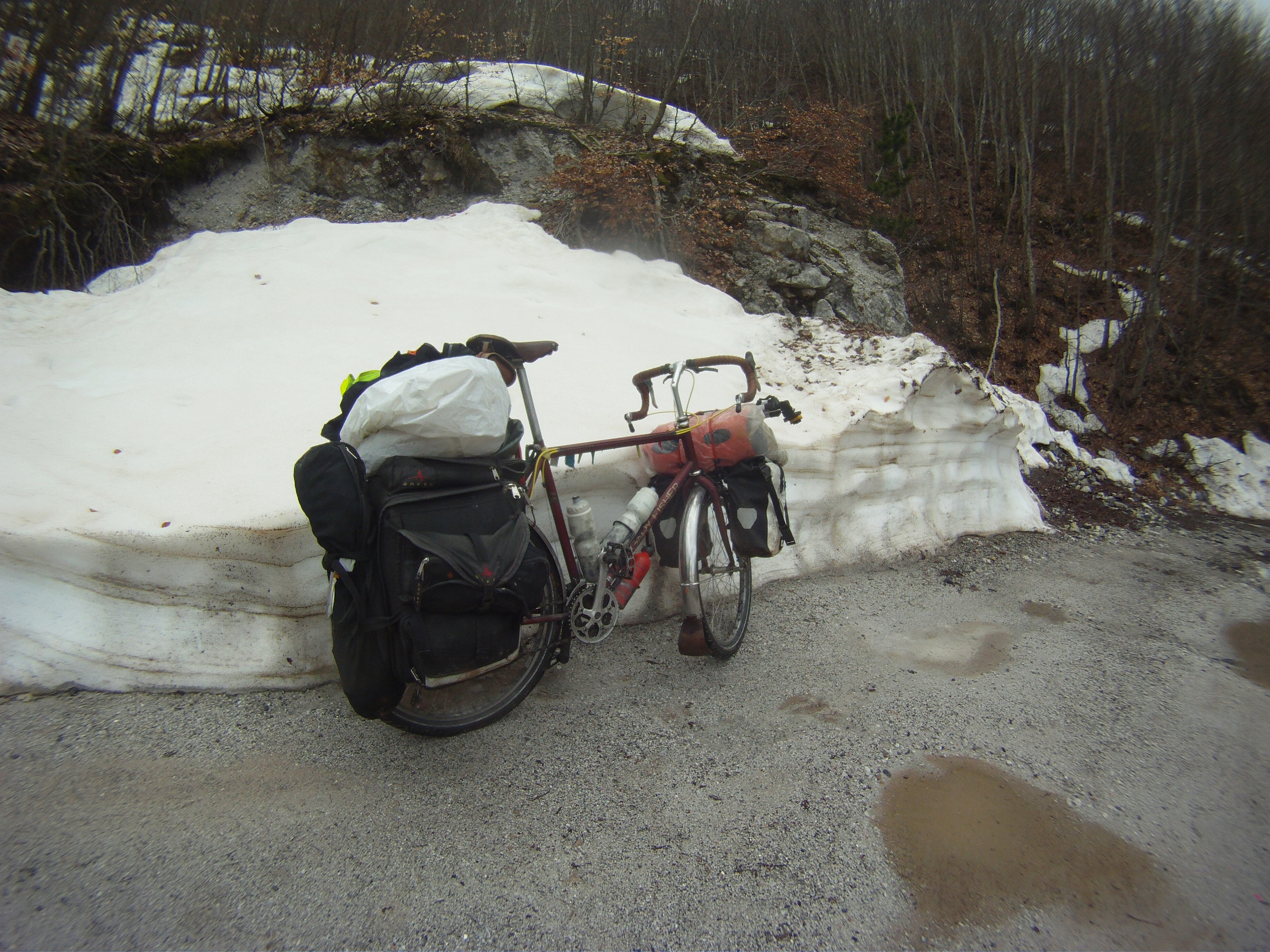 The muddy, pot holed asphalt turned into a rocky hell, where I constantly would slip out and bang my crotch on my saddle. Fuck!! This was like riding an angry horse in a stampede or rodeo! If I stood up to pedal my back tire would slide out, if I sat on the saddle while pedaling the front end would bounce sometimes pushing me off the road or into large stones. This was the ultimate work out, forget the popular Los Angeles “Insanity” regime, my core, arms and legs burned climbing into the snow-covered mountains. Hail turned to snow, temperatures dropped and soon I realized that the farther I pedaled the colder and more snow I would have to camp in. I was also still pedaling in my shorts and sandals, and me teeth were beginning to chatter. “Shit”!! Finding a place to camp proved more difficult than expected, all the flat open ground was covered in close to a meter of snow. Finally at a hairpin in the road I found a small section of open ground, pitched the tent and jumped in. Stripping down, I got into my sleeping bag naked and opened my Tolstoy novel Anna Karenina. Dreaming of a Russian ballroom dance party I feel into a deep sleep.