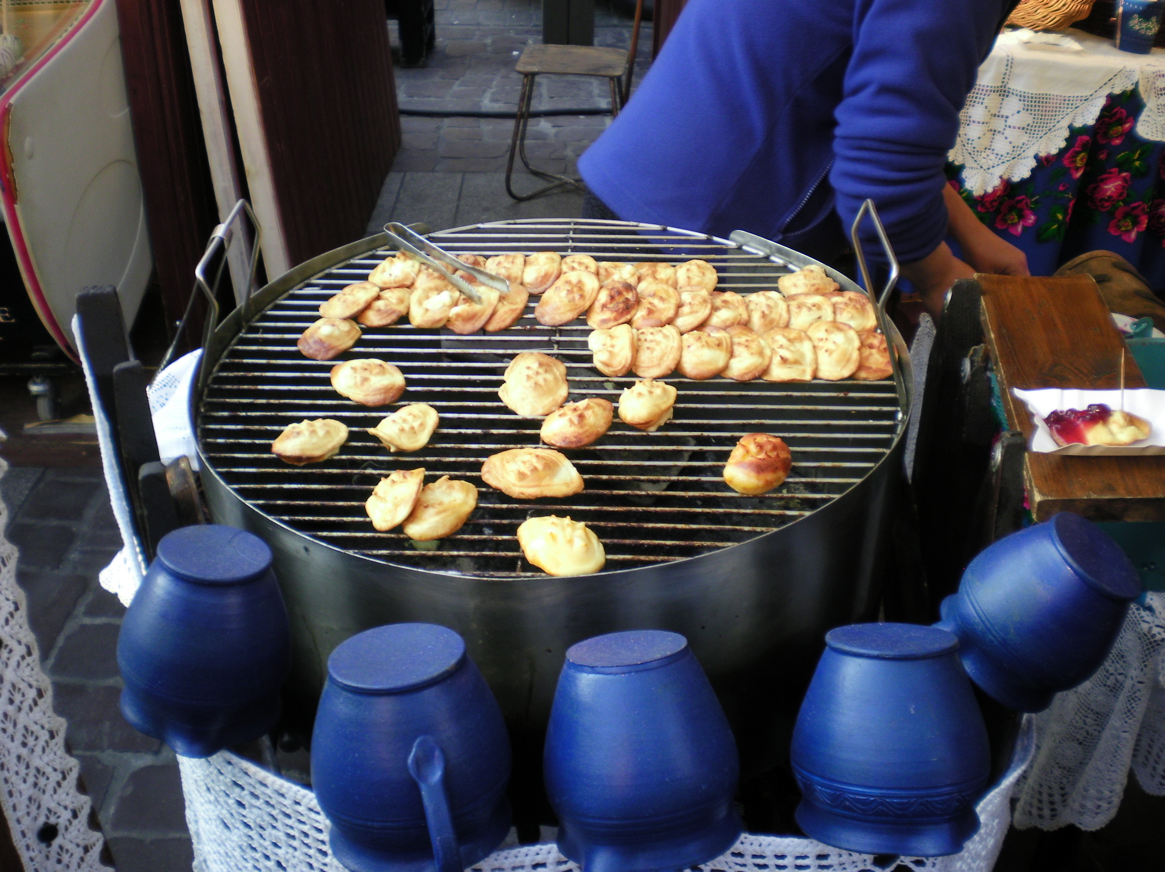 Two types of Perogis (dumplings) Polish and Russia, followed by a deep fried pancake filled with sauerkraut