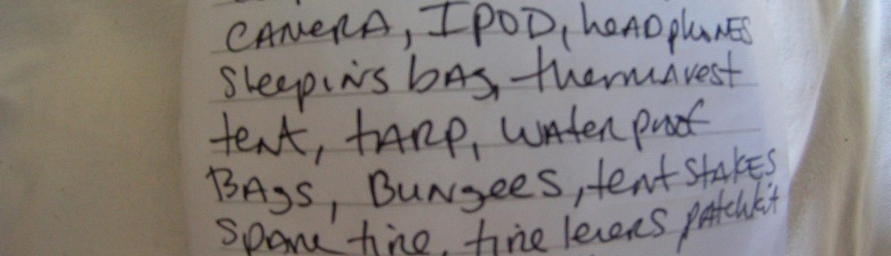 Foldable tire, pump with gauge, Swiss army knife, two inner tubes, patch kit, 3 tire levers, allen keys, 3 open end wrenches, 13/15 flat wrench for adjusting brakes, spare brake shoes, cables, chainlinks, nuts and bolts, chain breaker, spoke wrench, 10′ rope, cassette removal tool, electrical tape, Guerrilla tape, 5 titanium tent stakes, small bar of soap, zip ties, 5 bungee cords.